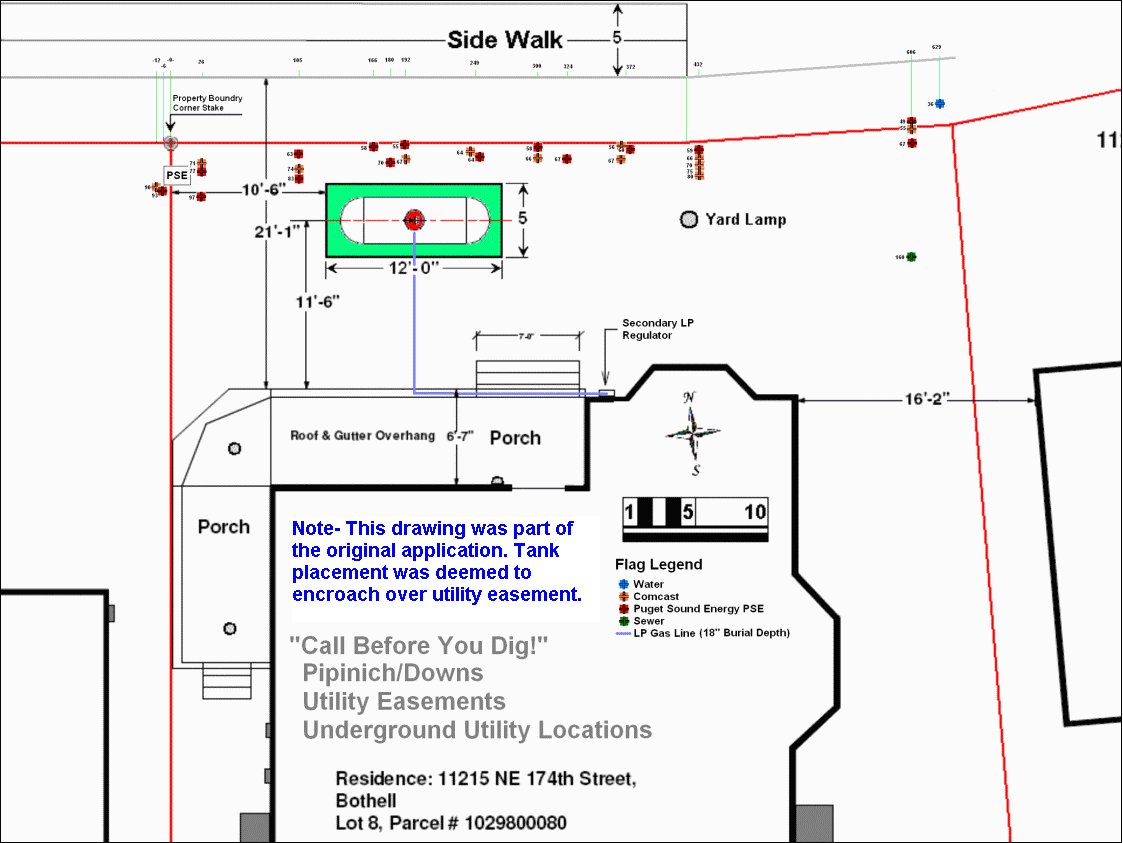 An animated drawing, illustrates revisions to the original proposed tank placement. See changes. The revised drawing, on the Construction Details Page, shows the 7' utility easement in blue. This new drawing has not yet been (re)submitted to Bothell. See NFPA 58, table 6.3.1 and section 3.3.11. (2) for separation distance requirements. It will not require an engineers stamp.